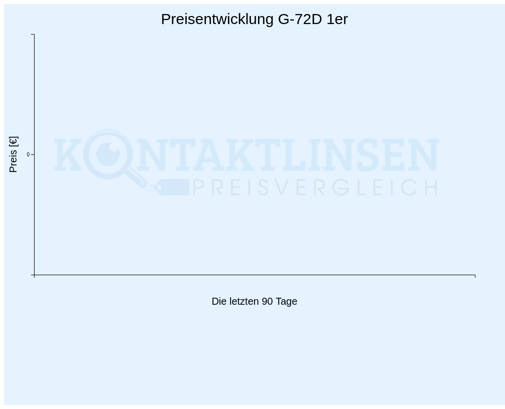 Wir speichern für jeden Tag die Preise für alle Kontaktlinsen. Im Folgenden finden Sie die preisliche Entwicklung für die letzten 90 Tage der G-72D und jeweils 2 Packungen. Den aktuellen Preis für andere Packungsanzahlen können Sie oben im Preisvergleich ermitteln.
